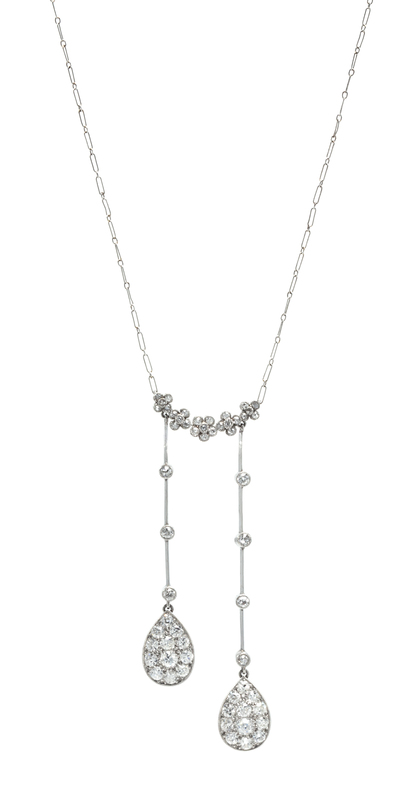 consisting of two pendants containing 57 old European and old mine cut diamonds weighing approximately 1.75 carats total suspended by knife edge links from a central row of fleurettes with attached elongated oval link cable chain. Stamp: DIC 18K.