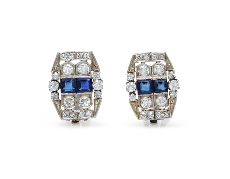 containing four square step cut sapphires weighing approximately 1.10 carats total, 12 old European and transitional brilliant cut diamonds weighing approximately 0.68 carat total, and 24 round single cut diamonds weighing approximately 0.36 carat total, white gold clip backs.