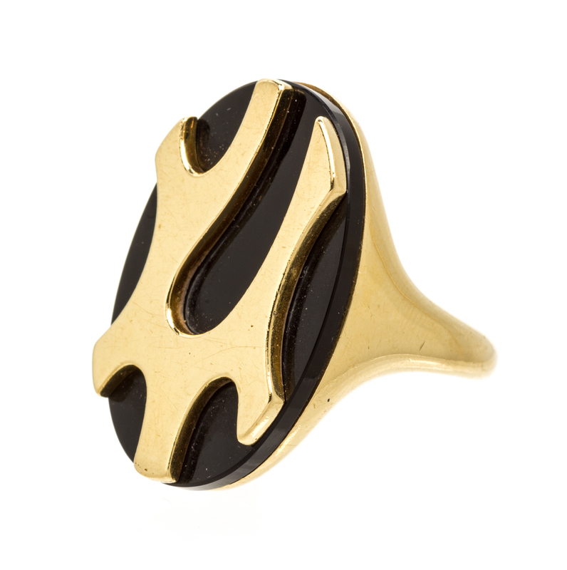 consisting of an oval onyx plaque measuring approximately 27.00 x 18.00 mm surmounted with an abstract yellow gold design.Stamp: C.Y. 18K.