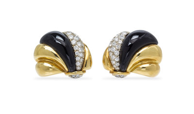 A Pair of 18 Karat Yellow Gold, Onyx and Diamond Earclips,