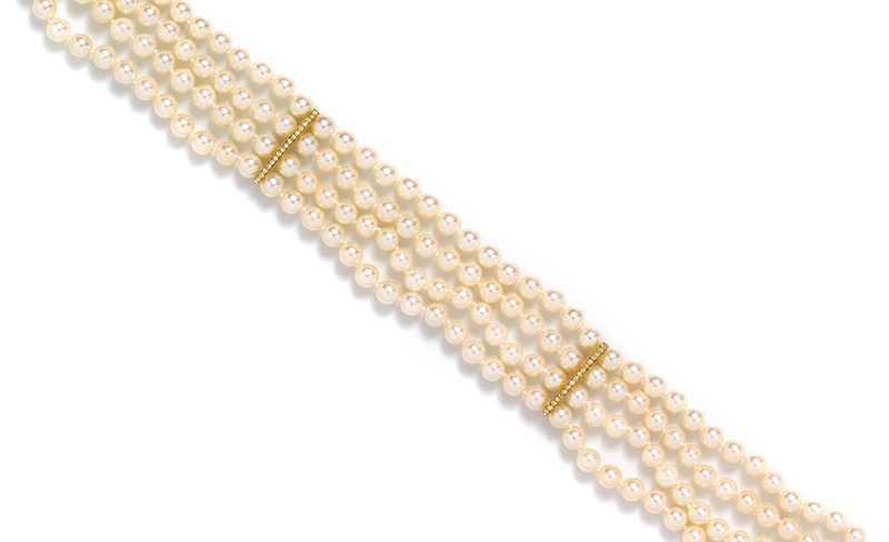 consisting of four strands containing 182 pearls measuring approximately 6.50-7.00 mm in diameter, strung knotted with a yellow gold clasp and two yellow gold spacers containing 68 round brilliant cut diamonds weighing approximately 0.51 carat total.Clasp stamp: (script H maker's mark) 18K.