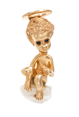 consisting of a sculpted gold cherub accented with two round mixed cut sapphire eyes perched atop a baroque pearl "cloud".Hand inscribed: 14K Ruser.