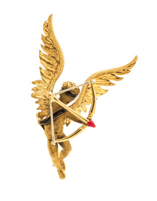 An 18 Karat Yellow Gold, Polychrome Enamel Blindfolded Cupid Brooch,