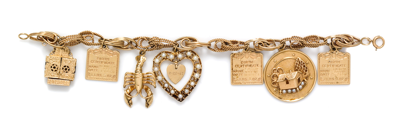 consisting of a three 14 karat birth certificate charms, a 14 karat house charm, a 14 karat heart and seed pearl charm, a 14 karat articulated lobster charm and a 14 karat articulated torah charm.