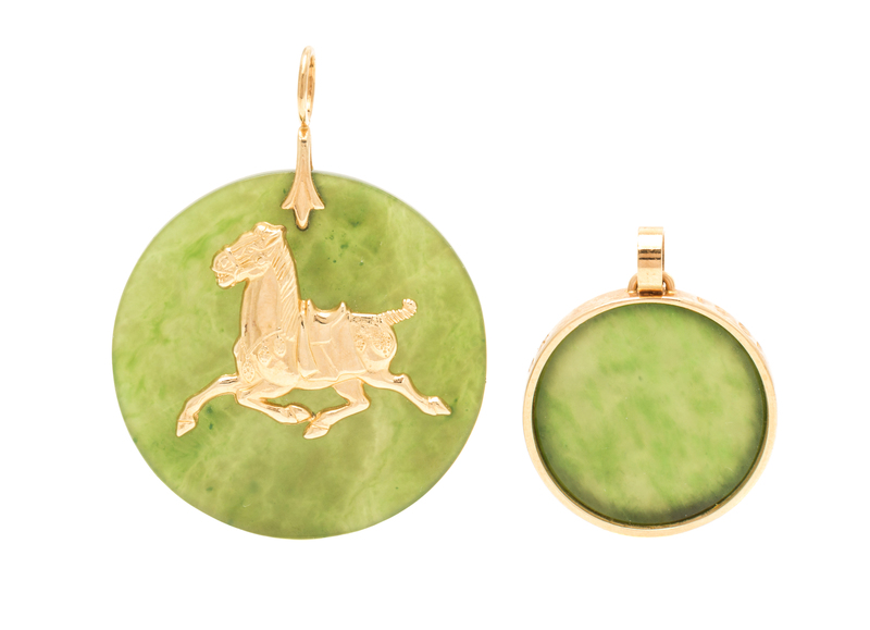 consisting of a yellow gold pendant containing one round jade tablet measuring approximately 20.34 mm in diameter and one pendant consisting of a round jade tablet measuring approximately 31.00 mm in diameter surmounted with a gold horse motif.