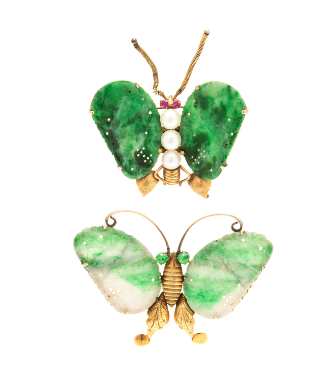 A Collection of 14 Karat Yellow Gold, Jade, Cultured Pearl and Ruby Butterfly Brooches,