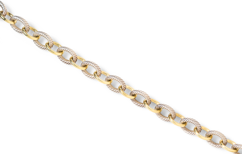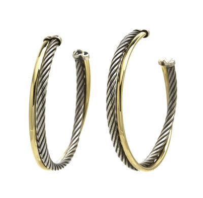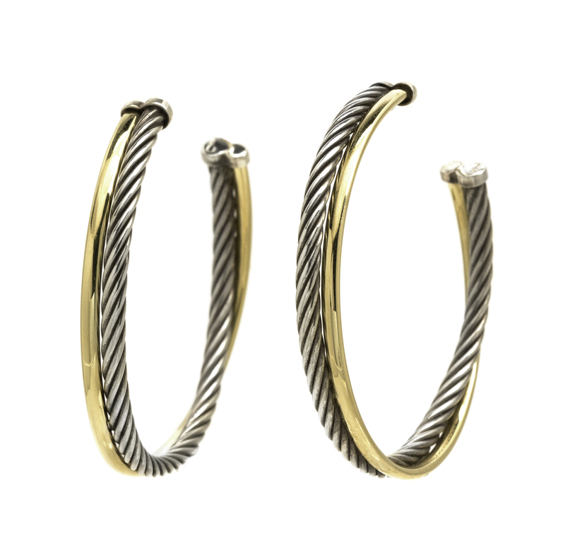 consisting of a large oval link necklace containing silver oval cable links alternating with polished bonded yellow gold oval links, together with a pair of Crossover hoop earrings of cabled sterling silver and polished bonded yellow gold.Stamp: DY 925 750.