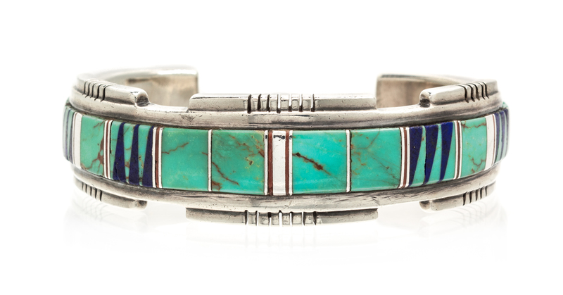 with inlaid segments of turquoise and lapis lazuli.Engraved: Sterling Ron Brown.