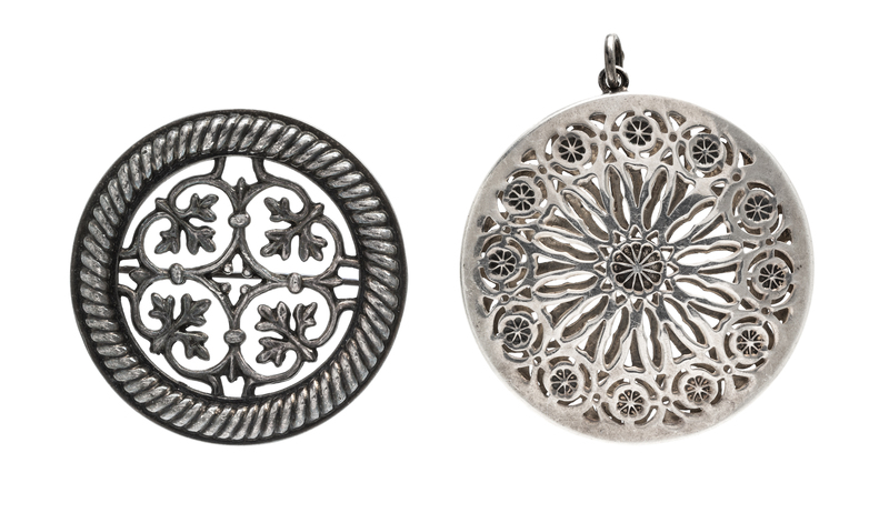 consisting of a tie bar, a round brooch with openwork designs, circa 1972, together with a round scent locket.Tie bar stamp: (post 1945 maker's mark for Georg Jensen) STERLING DENMARK 52B.Brooch STAMP: (maker's mark for KALEVALA KORU) (Swedish assay marks) 916H I7 (maker's mark).Pendant stamp: STERLING (assay and maker's marks) 4931.