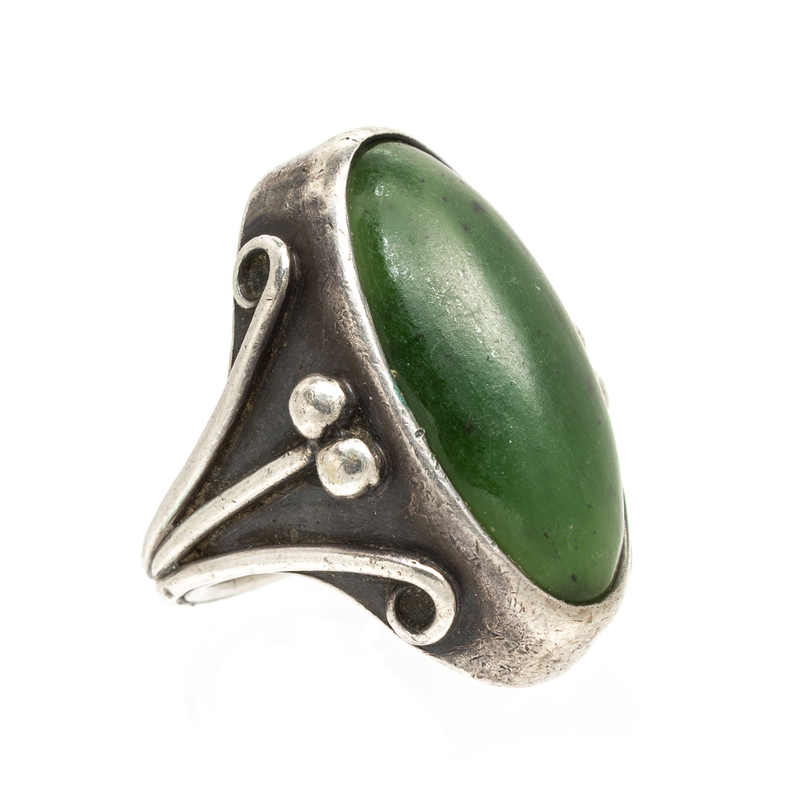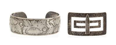 consisting of a hammered textured buckle, a poppy motif art nouveau style cuff bracelet, together with an arts and crafts style nephrite jade ring.Buckle stamp: STERLING.Bracelet stamp: STERLING (maker's mark).Ring stamp: (obscured assay marks).