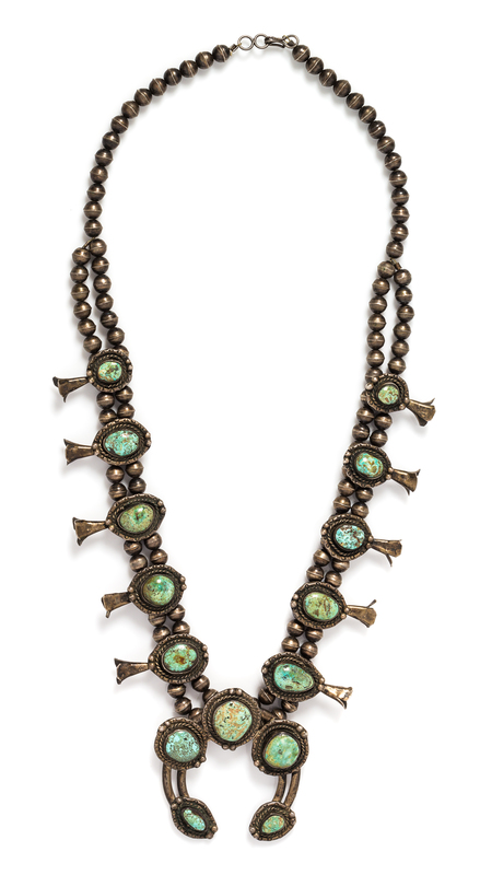A Silver and Turquoise Squash Blossom Necklace,