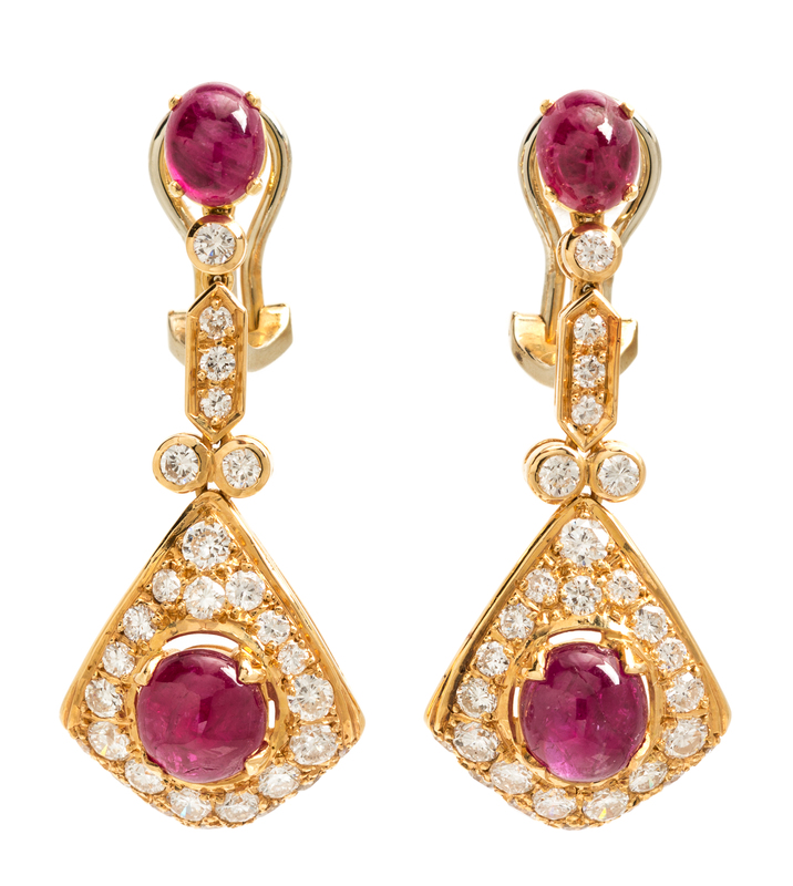 containing two oval cabochon cut rubies measuring approximately 6.50 x 5.40 mm, two round cabochon cut rubies measuring approximately 8.00 x 6.75 mm and 58 round brilliant cut diamonds weighing approximately 1.50 carats total.