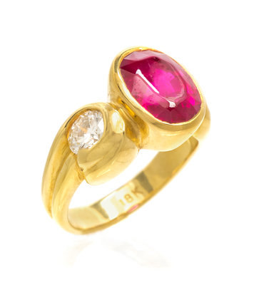 containing one oval shape mixed cut ruby measuring approximately 10.71 x 8.16 x 5.56 mm (weighing approximately 4.08 carats) and two round brilliant cut diamonds weighing approximately 1.00 carat total. Stamp: 18K.