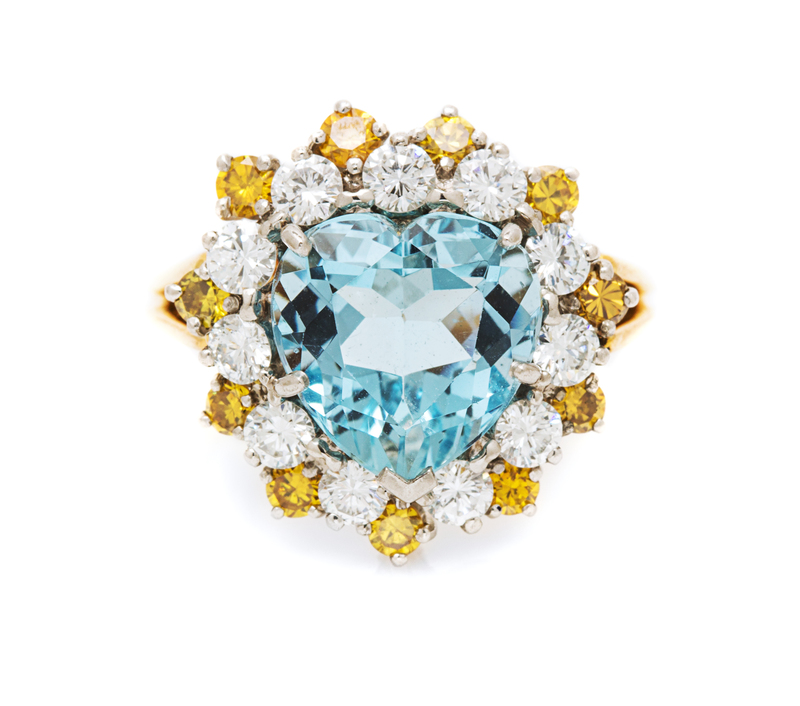 containing one heart shape brilliant cut aquamarine weighing approximately 3.06 carats, 11 round brilliant cut diamonds weighing approximately 0.88 carat total and 11 round brilliant cut yellow diamonds (origin of color not tested) weighing approximately 0.47 carat total. Stamp: IRID PLAT 18K.