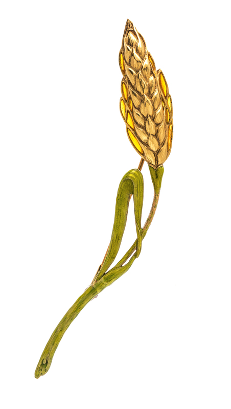 A Yellow Gold, Enamel and Plique-a-Jour and Enamel Wheat Motif Brooch,