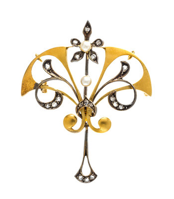 the gold surfaces having a bloom finish, containing two pearls (origin not tested) and numerous rose cut diamonds.