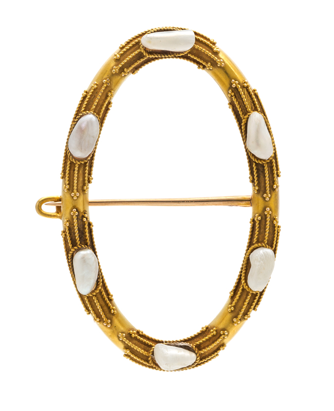 oval in shape with a matte finish and applied wire work design, containing six pearls (origin not tested).Clasp stamp: 14.