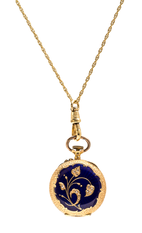 24.00 mm case diameter, white enameled dial, painted Arabic numberals, feuille hands, engraved bezel, the reverse containing nine rose cut diamonds within a foliate motif against a blue enamel and engraved background, stem wound and pin set seven jewel movement signed THE PEDRE CO, suspended from a 14 karat yellow gold longchain.Cuvette stamp: 18K 16685.Case back stamp: 18K 16683.