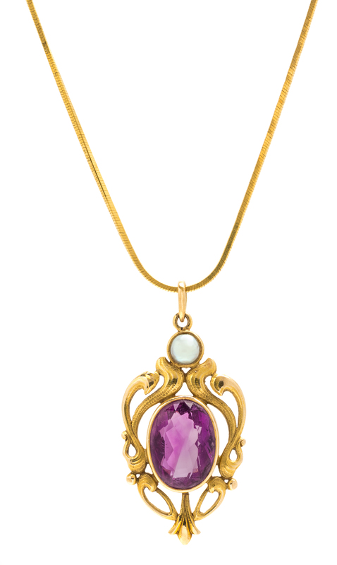 An Art Nouveau Yellow Gold, Amethyst, and Pearl Pendant,