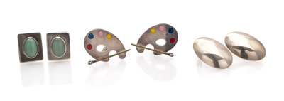consisting of a pair of sterling silver earclips containing two oval shape cabochon cut chalcedony measuring approximately 17.24 x 6.22 mm, a pair of sterling silver earclips in a painter's palette motif, and a pair of sterling silver oval dome shape earclips.Stamp: 925 MEXICO TA-181Stamp: TA-155 925 MEXICOStamp: (maker's mark) STERLING.