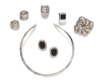 consisting of a sterling silver torque necklace, a silver swirl brooch, a silver ring with linear design, a pair of sterling silver cushion shape earclips, a sterling silver ring inlaid with a square onyx tablet together with a pair of sterling silver earclips containing two oval cabochon cut onyx.