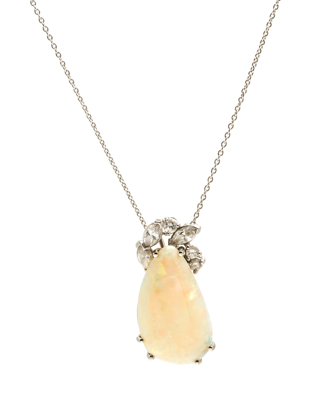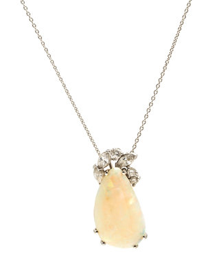 containing one pear shape cabochon cut opal measuring approximately 22.05 x 12.58 x 3.75 mm, three marquise shape diamonds weighing approximately 0.33 carat total and three round brilliant cut diamonds weighing approximately 0.15 carat total, suspended from a white gold chain.