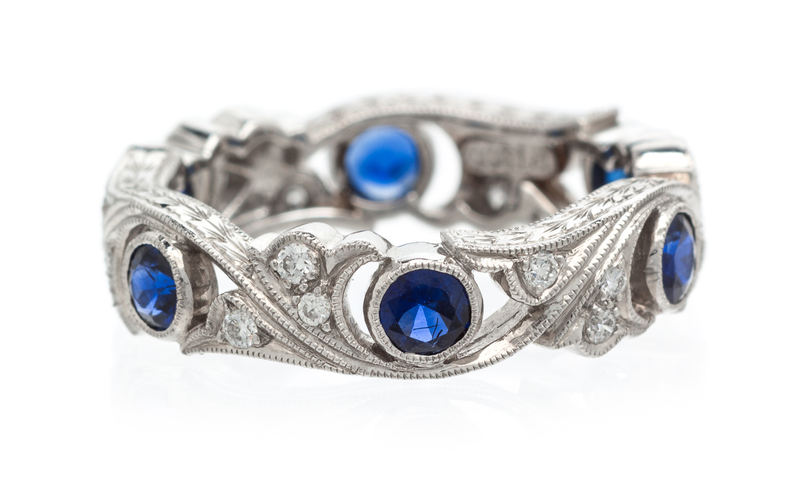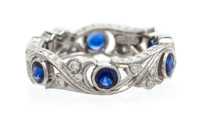 Ring: containing 18 round brilliant cut diamonds 1.2 - 1.5 mm. weighing containing numerous round brilliant cut diamonds weighing approximately 0.17 carat total and six round cut sapphires, with hand engraved detail and millegrain edging.Stamp: Pt900.