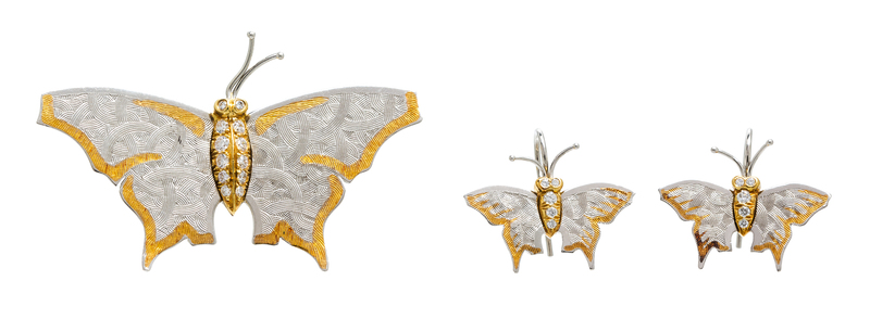 A Platinum, 18 Karat Yellow Gold and Diamond Butterfly Motif Demi Parure, Michael Bondanza,