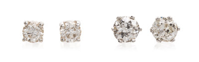 consisting of one stud containing one antique cushion cut diamond weighing approximately 0.25 carat and one stud containing one round brilliant cut diamond weighing approximately 0.25 carat, together with a pair of studs containing two round brilliant cut diamonds weighing approximately 0.38 carat total.