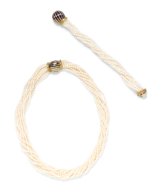 consisting of a necklace and matching bracelet, each containing 10 strands of seed pearls strung with yellow gold clasp with striped blue enamel.Bracelet stamp: 18K ITALY MERRIN.Necklace stamp: 18K MERRIN.Accompanied by a necklace sleeve signed MERRIN.