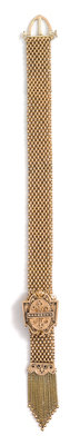 consisting of a yellow gold mesh link bracelet with gold slide clasp accented with black enamel detail and yellow gold tassel terminals.