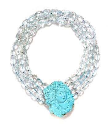 consisting of four strands of faceted aquamarine beads strung knotted with a clasp containing a carved turquoise cameo of a classical female profile with flowers in her flowing hair.Engraved: 14K.