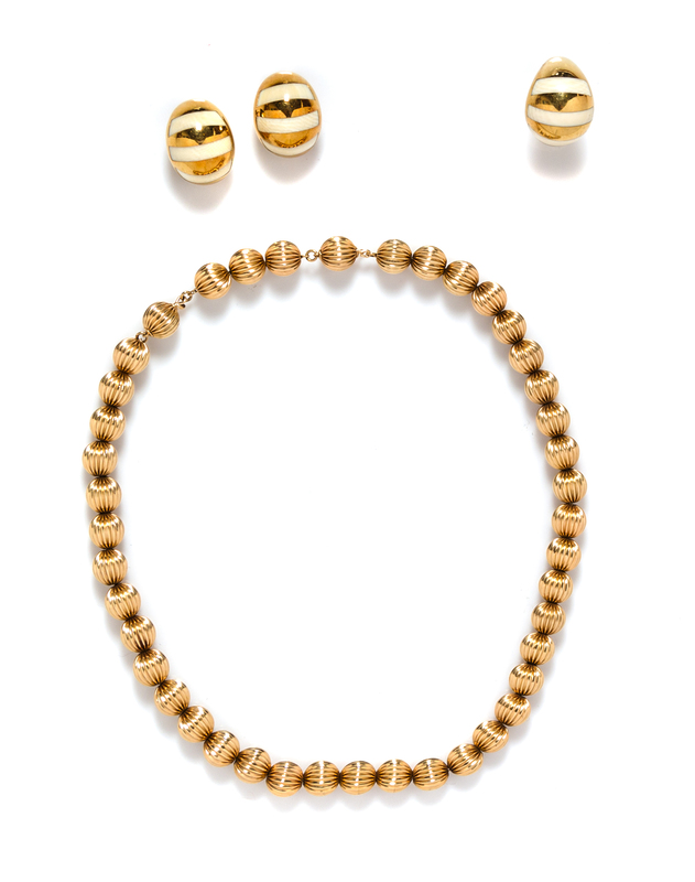consisting of 43 round ribbed beads measuring approximately 9.75-10.00 mm in diameter strung on a chain, including a four bead extender.Stamp: 14K.