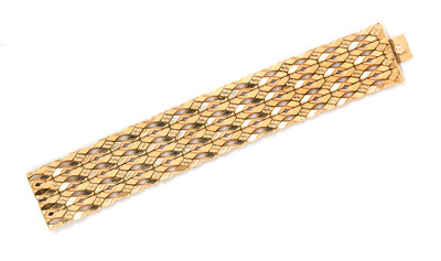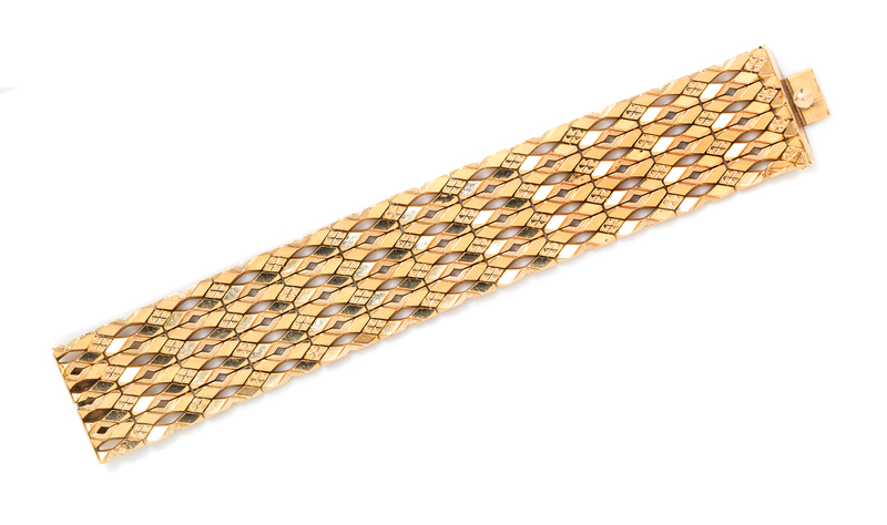 consisting of four rows of openwork links with textured gold details measuring approximately 30.00 mm in width.Stamp: 750 98V MAR.