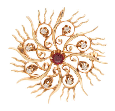 A Collection of 14 Karat Yellow Gold, Ruby and Diamond Brooches,