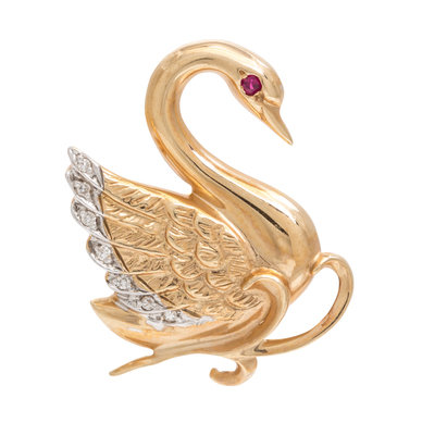 consisting of a swan motif brooch containing one round cut ruby and seven round single cut diamonds, together with a starburst motif brooch containing one round mixed cut ruby measuring approximately 3.66 mm in diameter and eight old mine cut diamonds.