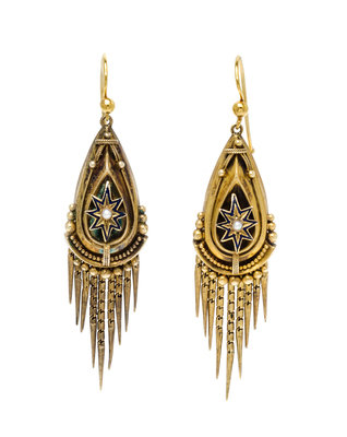 set centrally with two seed pearls within blue enamel star motif borders, accented with beaded and textured detail, the bases suspending a chain link fringe with dart terminals.