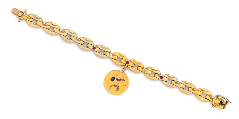 A Vintage 14 Karat Yellow Gold Diamond, Sapphire and Ruby Bracelet with Charm,