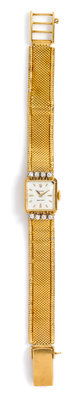 the lugs containing eight round brilliant cut diamonds weighing approximately 0.28 carat total, 15.00 x 16.00 mm case dimensions, white dial signed ROLEX, applied gilt index numerals, gilt lancette hands, snap on case back, manual wind 17 jewel movement signed ROLEX, mesh bracelet with fold over clasp.Inner case back stamp: MONTRES ROLEX GENEVA SWITZERLAND SA 18K 750 82.Clasp stamp: 750 CB.
