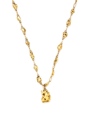 consisting of numerous freeform natural gold nugget shapes suspended between oval shaped links and one larger pendant.Stamp: 10K.