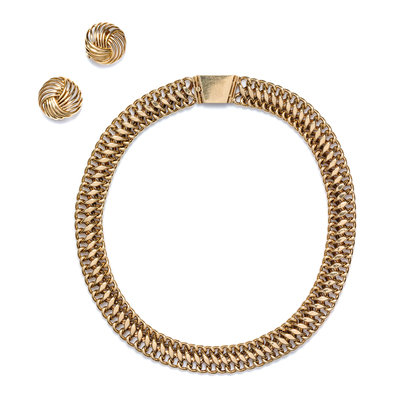 consisting of a figure-eight link necklace measuring approximately 14.20 mm wide, together with a pair of earclips in an openwork knot motif measuring approximately 21.45 mm in diameter.Necklace Stamp: 14K BB.Earclip Stamp: 14K.
