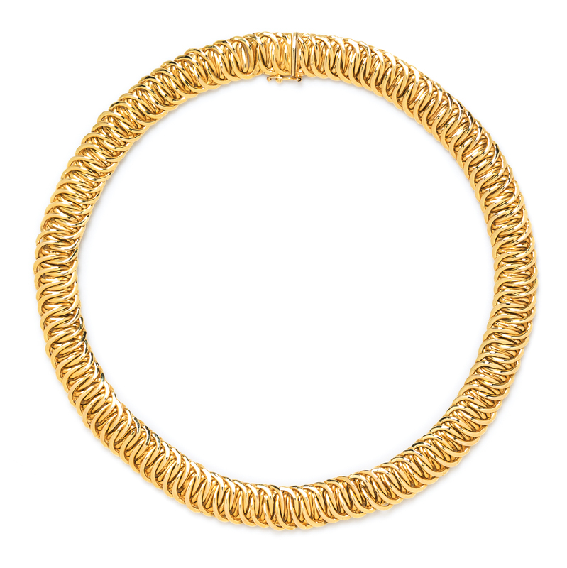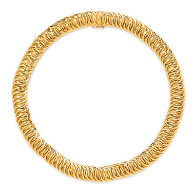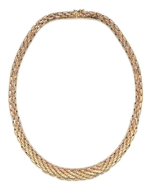 consisting of a tri colored graduated brick link necklace, together with a fancy link necklace measuring approximately 12.00 mm in width.Stamp: 14Kt ITALY.Stamp: K14 ITALY.