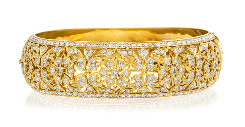 consisting of an openwork floral motif, containing numerous round brilliant cut diamond weighing approximately 4.21 carats total, side hinge with button closure.Stamp: K18.