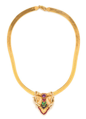 consisting of a ribbon motif slide/enhancer containing one heart shape mixed cut amethyst, five marquise cut emeralds, six marquise cut sapphires, numerous round mixed cut and calibre cut rubies and numerous round single cut diamonds, suspended from an engraved herringbone chain measuring approximately 7.00 mm in width.Chain stamp: 14KT ITALY.