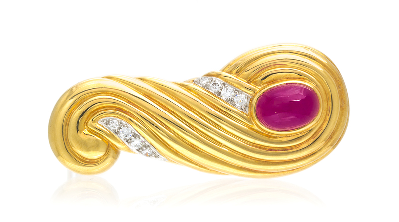 An 18 Karat Yellow Gold, Ruby and Diamond Swirl Brooch, Chaavae,
