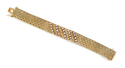 consisting of a woven mesh bracelet containing 25 round brilliant cut diamonds weighing approximately 1.00 carat total. Stamp: 14K.