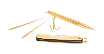 consisting of a yellow gold tone fish hook, two 14 karat yellow gold toothpicks with alligator sheaths, a 14 karat yellow gold pocket knife by Larter & Sons, together with a 14 karat yellow gold pencil.