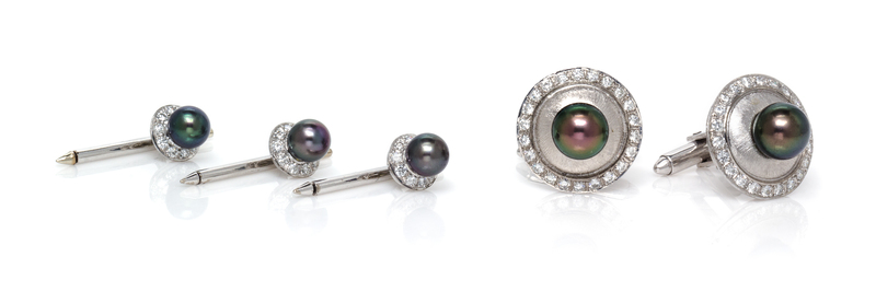 consisting of a pair of circular cufflinks containing two dark grey pearls measuring approximately 9.25 mm in diameter within textured surrounds and outer borders set with 44 round brilliant cut diamonds weighing approximately 1.10 carats total, together with three matching dress studs containing three dark grey pearls measuring approximately 7.00 mm in diameter and 30 round brilliant cut diamonds weighing approximately 0.60 carat total.Cufflink stamp: TRIO 14K.