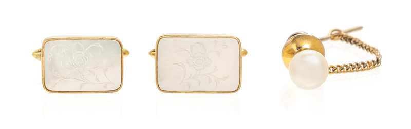 consisting of a pair of 14 karat yellow gold cufflinks containing two etched mother-of-pearl tablets, together with a yellow gold tie tac containing one cultured pearl measuring approximately 8.39 mm in diameter. Cufflink stamp: 14K 585.