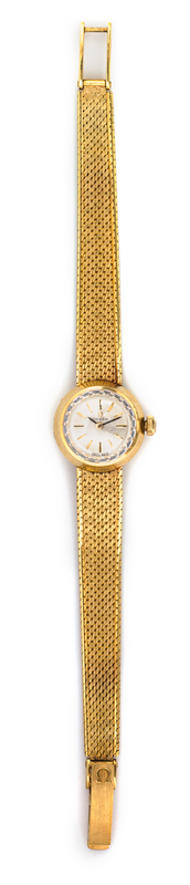 17.00 mm case diameter, matte silvered dial signed OMEGA, applied gilt index numerals, black enamel pencil hands, snap on case back, manual wind 17 jewel movement signed OMEGA WATCH Co., gold mesh bracelet, fold over clasp.Movement number: 22686543.
